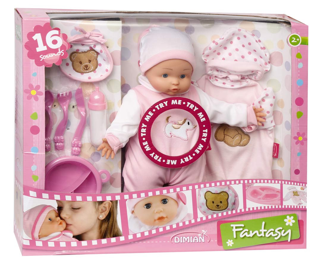 Bambola con accessori cm. 36, la confezione include una bambola e tanti accessori per giocare come il set pappa, biberon, tutina per il cambio... La bambola emette 16 suoni diversi. Da 2 anni.