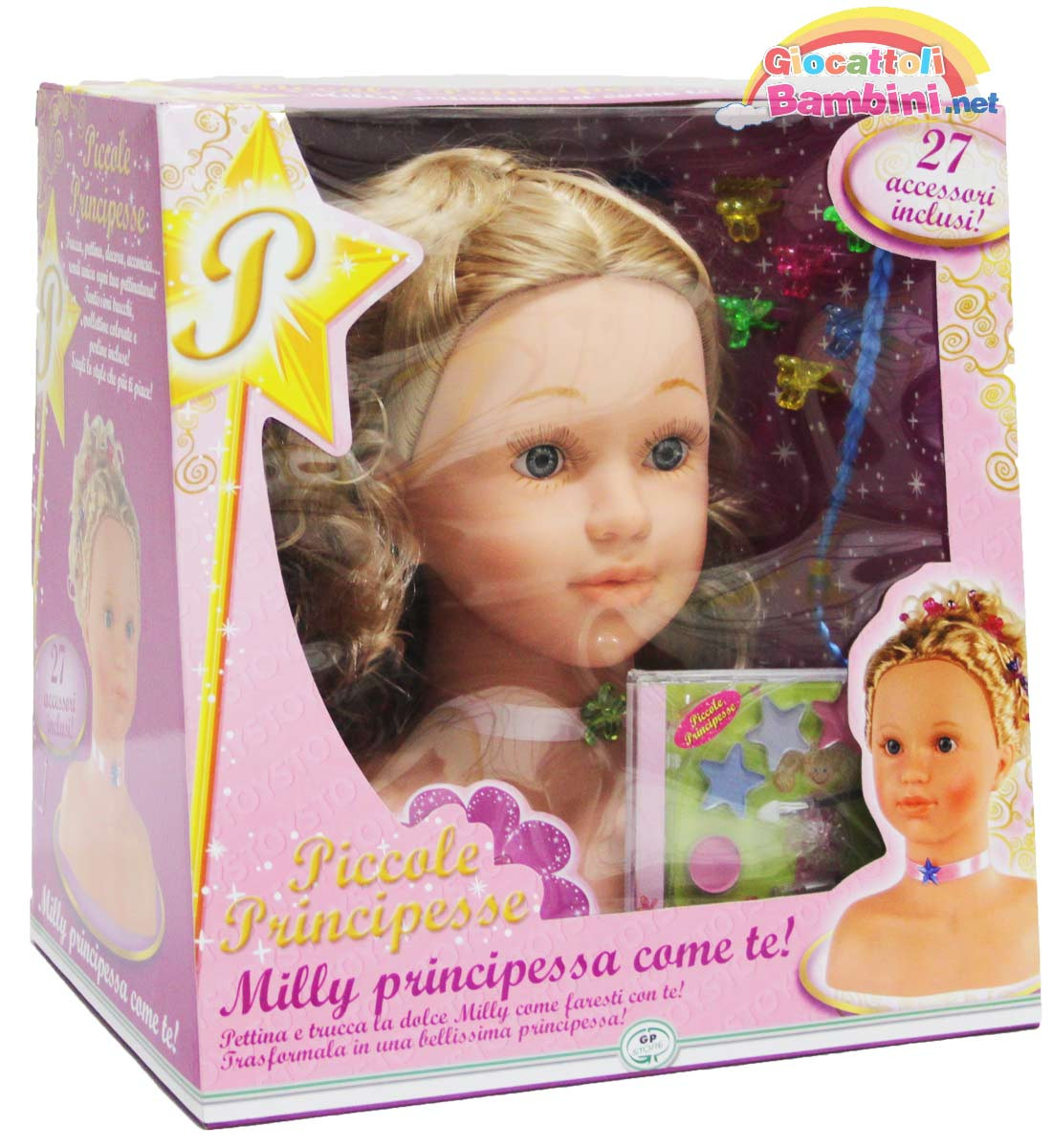 Busto di Bambola da poter truccare ed acconciare come piu' ti piace, include tante mollettine, spazzola, pettine e trucchi, ben 27 accessori, da 3 anni