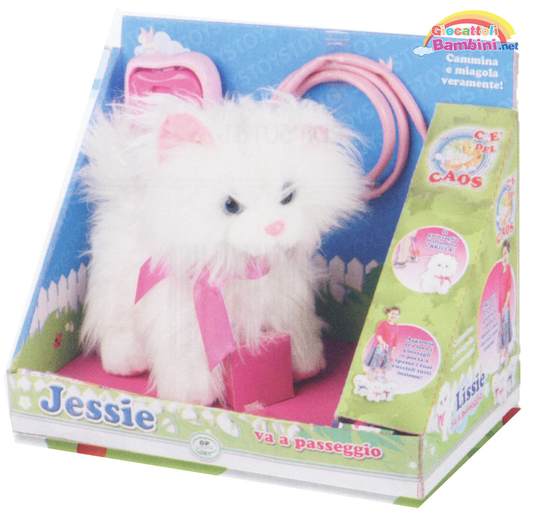Dolce gattino da portare a spasso con il guinzaglio. Quando Jessie cammina, miagola, in più il guinzaglio brilla e si illumina. Aggancia tra loro i guinzagli e porta a spasso i tuoi cuccioli tutti insieme! Da 3 anni in su'.