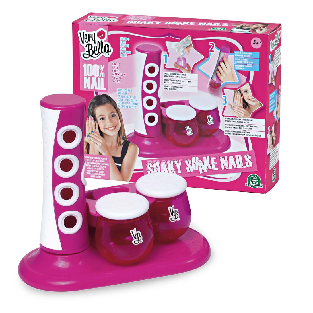 Very bella shaky shake nails, la confezione include: 1 base, 1 tubo decoratore, 2 contenitori per glitter, 2 buste con glitter colorato, 1 foglio con bi-adesivo, 1 foglio con sticker decorativi per unghie, 5 tappi per chiusure tubo decoratore, da 5 anni.
